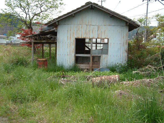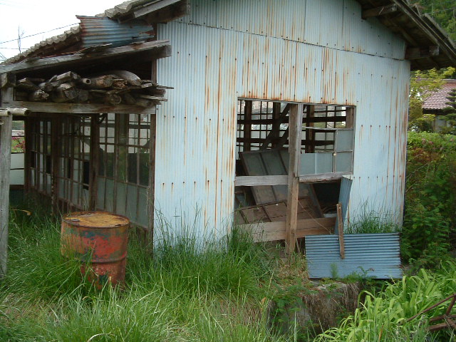 少し角度を変えると、薄暗い屋内が垣間見える。かつては農具などを収納していたのかも知れないが、現在は板切れやら何だかの廃材しかない。野放図に伸びた雑草、所々抜け落ちた窓ガラス、来訪者を拒絶する闇は、最早農具入れと機能しているとはお世辞にも言い難い。