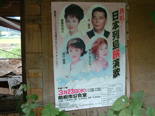 で、潰れた店の壁にこんなモノが貼り付けてあった。こんな所に張ったって誰も見ないだろうに…………。それともこれを張った当時はまだこの店が生きていたというのだろうか?………それにしても千 昌夫の顔久しぶりに見た気がする………いや、演歌歌手の顔なんてあんまり知らんけどな。